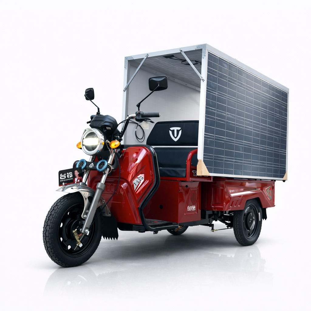 Карго електрическа триколка със соларен фургон 750W-1000W номинална мощност на соларите. 500кг товароносимост. Новият модел е снабден с 72V батерия, високопроизводителни батерии от последно поколение BLACK GOLD с увеличен капацитет.