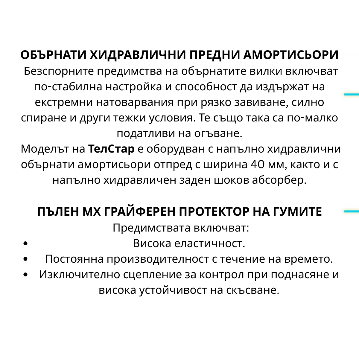 - По-здрава конструкция, по-добър контрол при рязко завиване и спиране. 40мм напълно хидравлични амортисьори отпред и отзад.