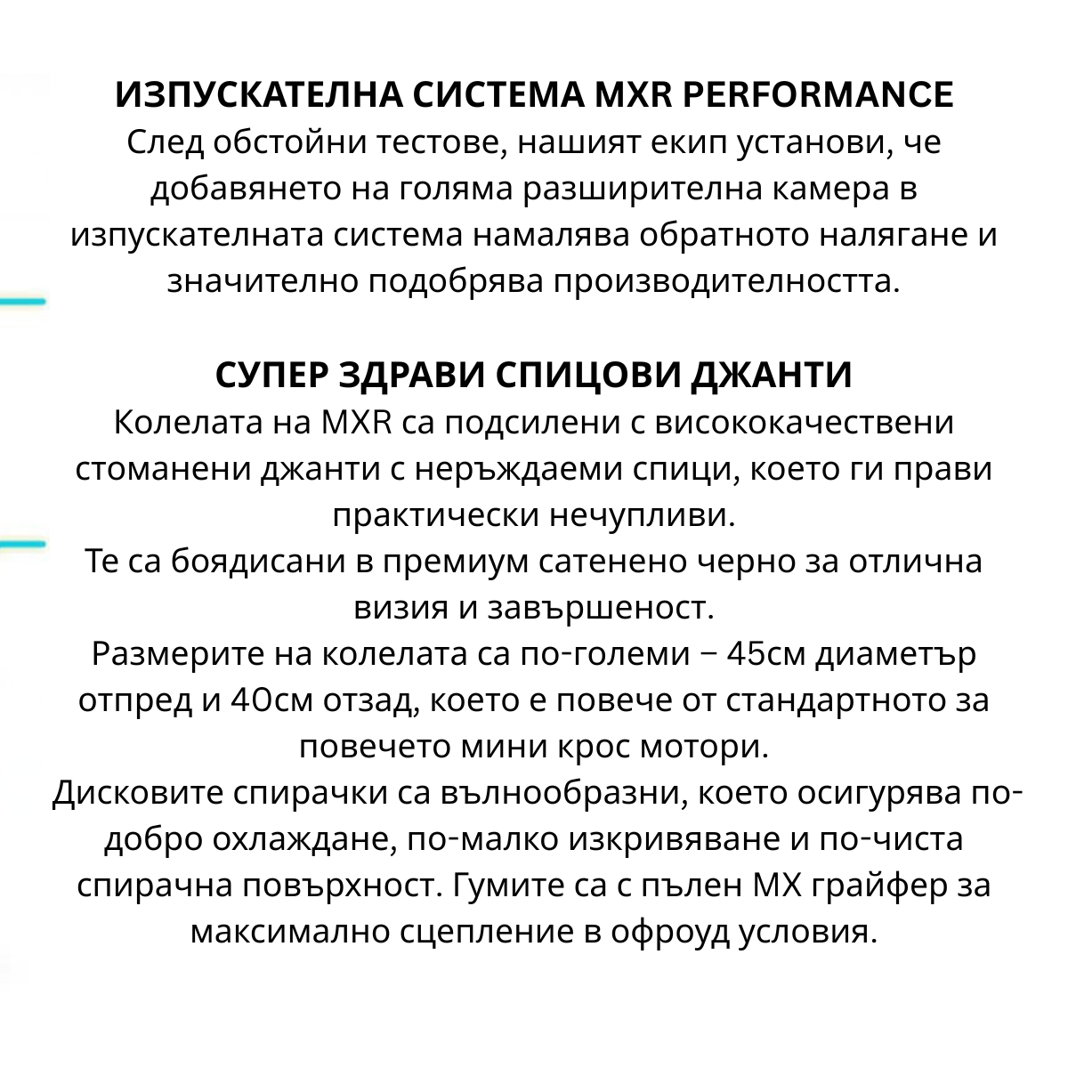 Детски кросов мотор MXR 70CC Нов модел / DIRT BIKE с добавена функция "Лесен старт". Надежден и мощен мотор за деца, съчетаващ здравина, стабилно окачване и отлична проходимост.